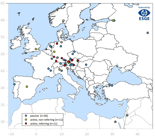 A supply network of ESD centers (>54 centers) across Europe now is on competent (>30 ESD) or professional level (>150 ESD), and 29 centers started ESD (Fig. 1B) – and at least 11 additional uninvolved ESD centers have published ESD series in Europe. Implementation of ESD – mainly in elderly often comorbid patients - was achieved with low risk mainly in colorectum (Fig. 2,3)(ref 1). Expert-guided training in live animals no longer is needed for starting clinical ESD by unsupervised self-learning (ref 2). Now, guidelines recommend to start clinical ESD (first ≤ 20 procedures) under supervision/tutoring by an ESD expert.
