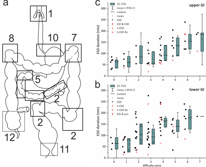 a. Anatomic sites with increased difficulty score (dotted line = +1 point, solid lines = +2 points) for colorectum ), and in exploratory modification for the upper GI tract. Numbers give the number of ESD-ITT performed in these sites, i.e. in sum 50% of all ESD-ITT. Graphs on right panel show the duration (min) of ESD-ITT plotted for the ESD difficulty score of the lesion & location, b. for the validated Score of Li in the colorectum, and c. for the score modified for the upper GI tract (compare Fig. 5), where duration correlates as strong (R = 0.550, P<0.00001) with the score as in colorectum (R = 0.515, P<0001). Note the different icons for ESD-ITT procedures: ESD en bloc; h-ESD en bloc R0; h-ESD Rx (Nov. 2009); EID & pmEMR for rectum LST-GM; ESD & EID at cardia (score 6), and STER & EID for esophageal leiomyoma score 4).